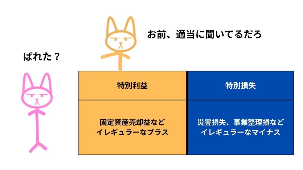 ちなみに、経常利益から特別損益を除いたものを税引前当期純利益(経常利益 + 特別利益 – 特別損失)と言います。