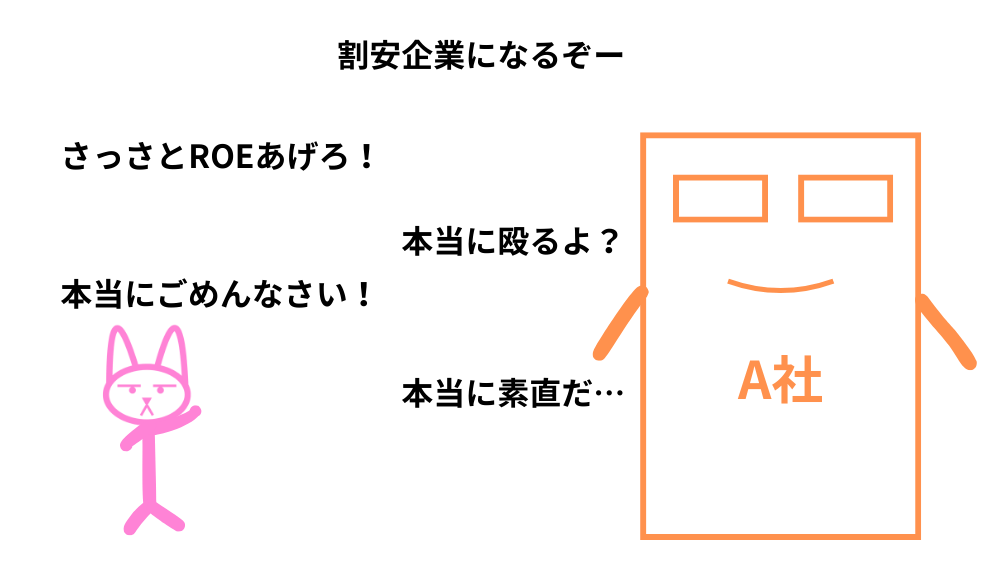 しかしA社はROEが1%と低く、「稼ぐ力(ROE)が弱いこと」がPBRの低さに反映されていると考えられます。