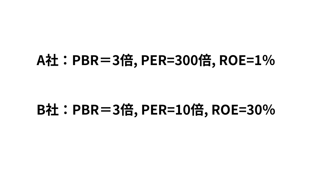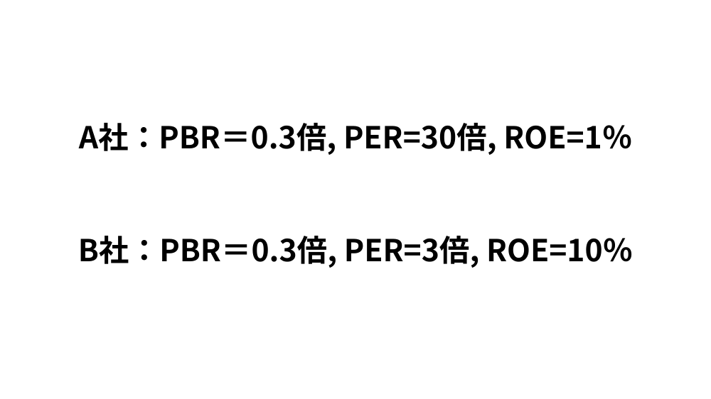 A社とB社はどちらもPBRは0.3と低く、一見すると割安に見えます。