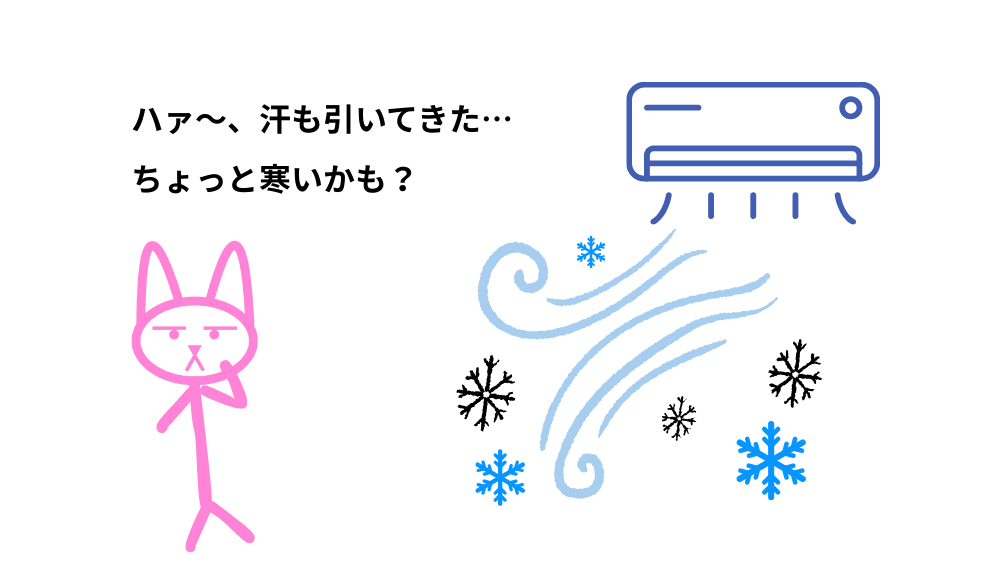 少しすると逆に部屋が寒くなりすぎて、今度はエアコンを止めます。