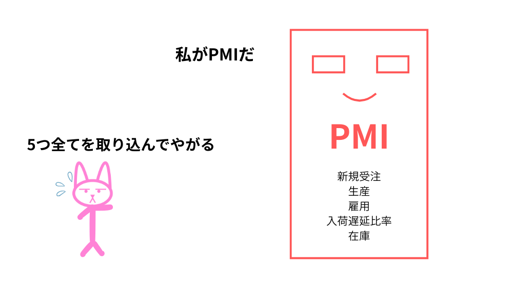 この5つの項目をもとに算出される総合指数をPMI(購買担当者景気指数)と呼びます。