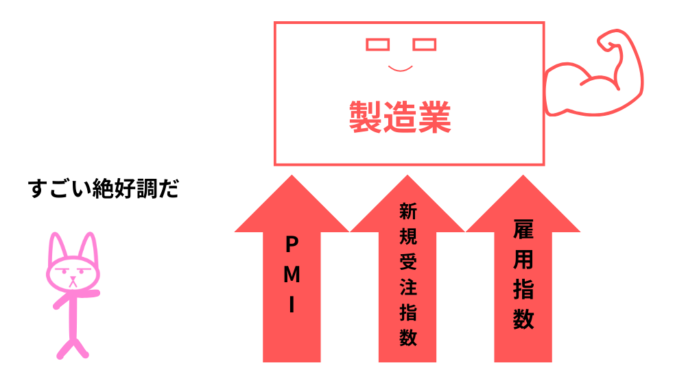 「PMI・新規受注指数・雇用指数」の3つが同時に上昇している場合は、製造業全体の景気が良くなっていると考えられます。