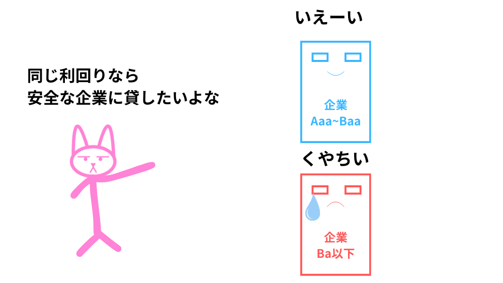 同じ利回りであれば、誰もがより安全な企業にお金を貸したいと考えるため、リスクの高い企業は高い金利を払わなければ資金を集められません。