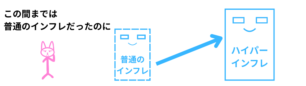 普通のインフレとは違うのは、短期でインフレが爆発的に加速して、通過の信用崩壊が経済へ混乱を招くと言ったのが特徴です。