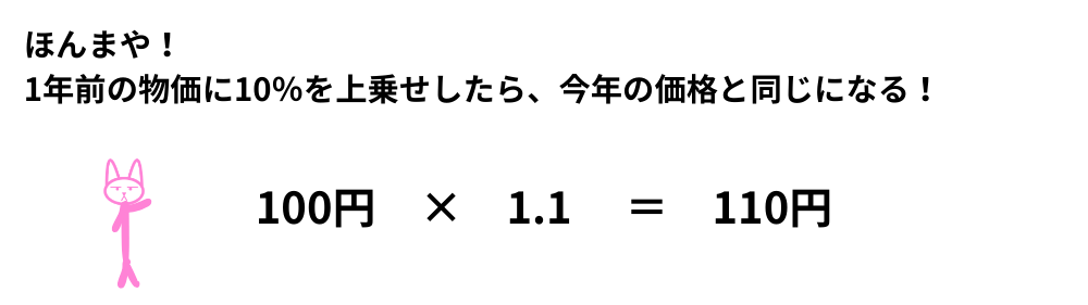 インフレ率 = (今年の物価 − 去年の物価) ÷ 去年の物価 × 100