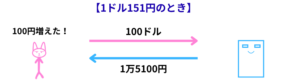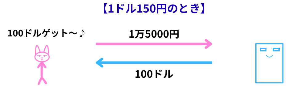 たとえば、1ドル=150円のときに、1万5,000円分のドル(100ドル)を買ったとします。