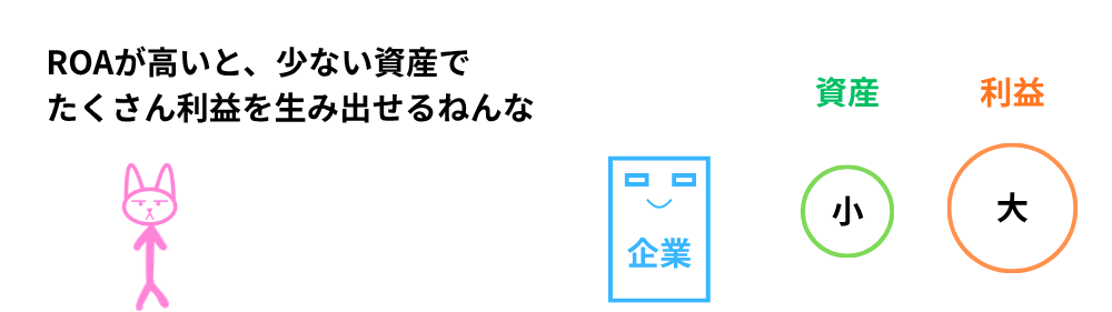ROAとは、会社が持っている資産を使って、どれだけ効率よく利益を生み出せているのかを示す指標なんだなって覚えておいてね。