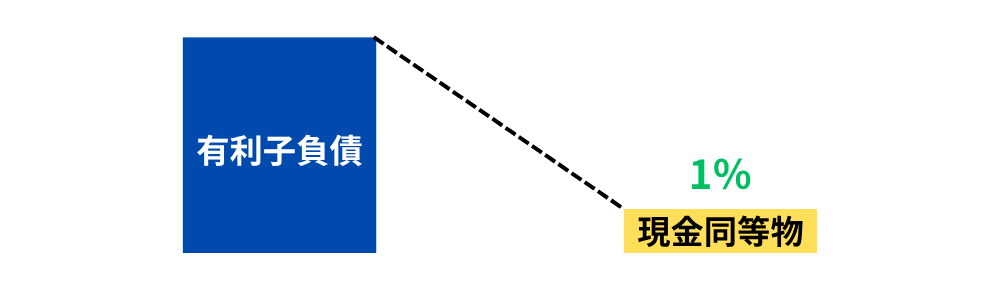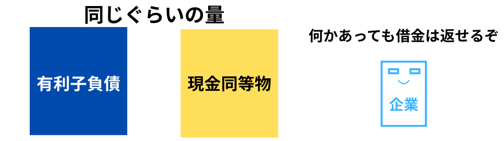 そのため、有利子負債と現金同等物のバランスが重要です。
