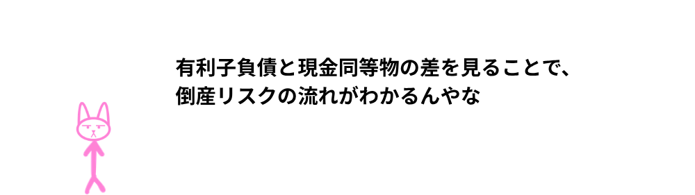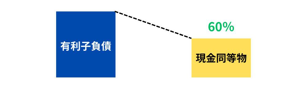 この場合は、現金同等物の方が少ないものの、有利子負債の60%と、ある程度の資金余力があるため、倒産リスクは比較的に抑えられていると考えられます。